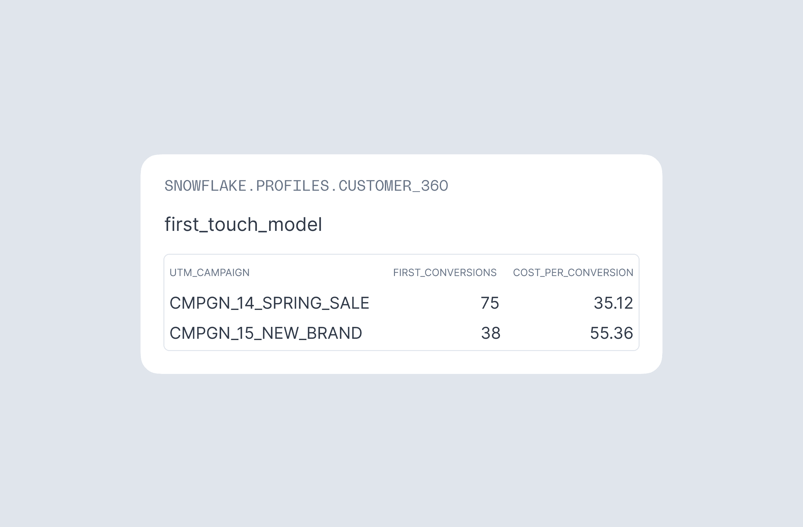 Our Attribution Data App automatically joins user-level data with campaign performance data to deliver first and last-touch attribution for paid campaigns out of the box. You can easily modify the code-based configuration to support complex definitions, the model and the SQL it produces are fully transparent, and the output table gives you all the metrics your marketing team needs to optimize spend, including ROAS and CAC.