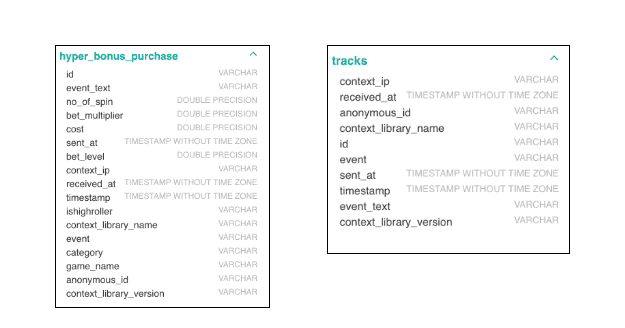 Left: BigQuery table for a particular event type<br>Right: BigQuery table for all events