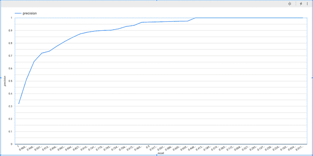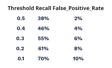 When a model makes a prediction, it also associates a probability of being correct or confidence for each class that it predicts. For a 0.1 or 10% threshold, the class that has been predicted with greater than or equal to 10% confidence as the class for a particular user – the recall is 70%, and the false-positive rate is 10%. This means that the model correctly identified 70% of the users who actually churned as churn candidates. Only 10% of the users who did not churn were wrongly classified as churn candidates.