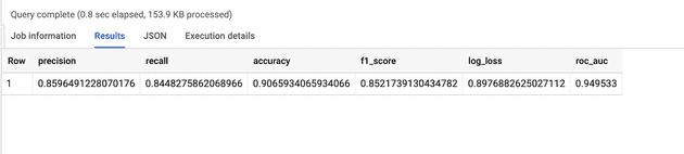 The above query takes the test dataset from the data containing all features for all the users, evaluates the model performance. Basically, the model will predict the value of the within_3_days column considering all other features. We then compare the predicted value against the actual value to calculate the model performance statistics.