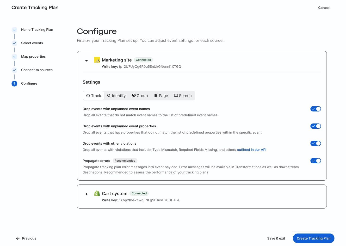 You can create and enforce Tracking Plans for any combination of sources. Your marketing team likely needs to track different events from your mobile product team. RudderStack enables each team to set up and enforce their own tracking plans but keeps the data team in control.