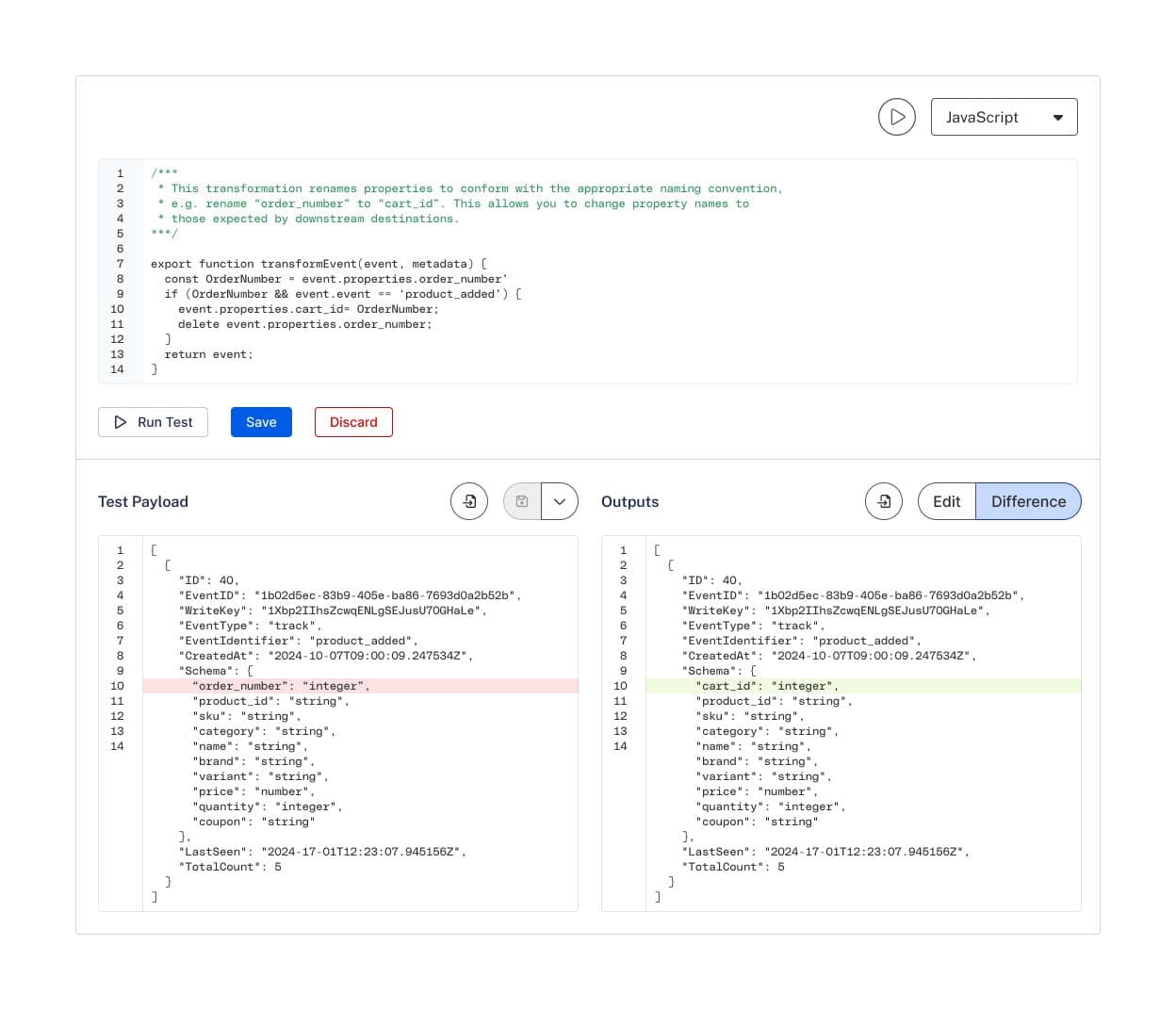Change property and trait names: Whether it’s a mismatch in your destination, mistaken instrumentation, or marketing changed a field name all of a sudden, Transformations enable you to rename event fields without opening a dev ticket, so you can ensure the data matches the destination schema before it gets there.