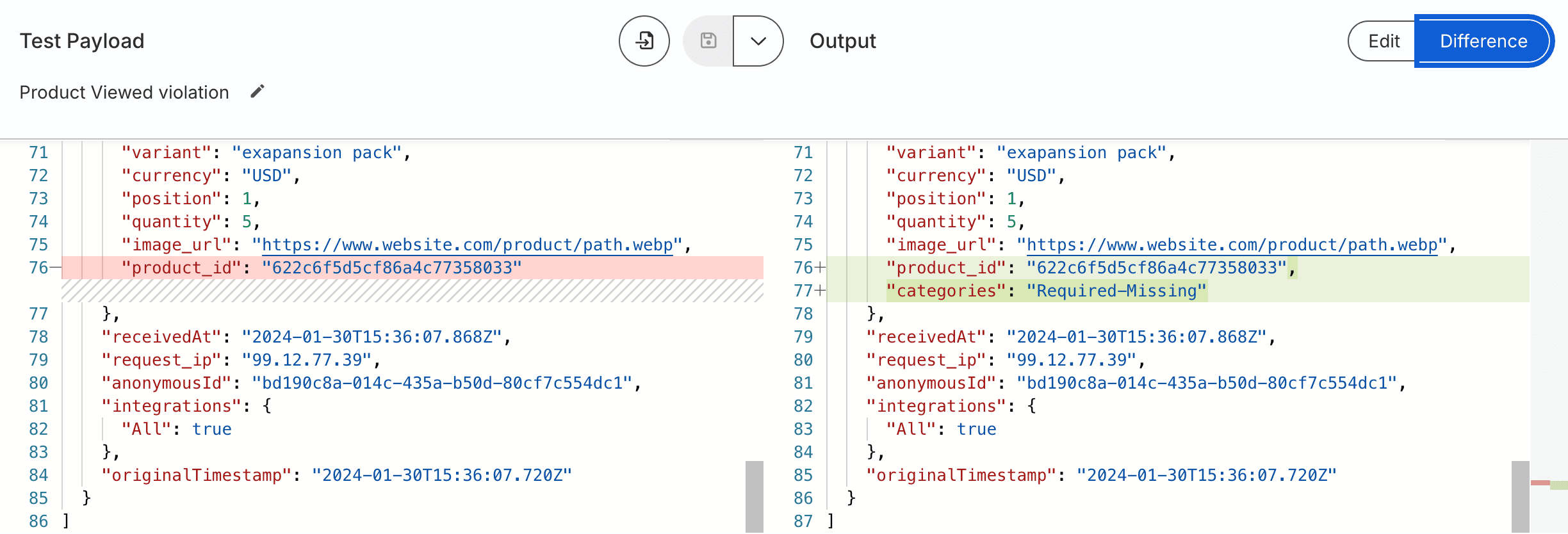 Send error diagnostics to downstream systems: Fixing bad data is helpful, but many times payloads are missing critical information altogether. To mitigate problems with analytics and marketing automation, you can forward diagnostic information from the violationErrors object in the payload so that teams can use it to quickly fix analytics and exclude users from marketing automations that would otherwise send them incomplete or inaccurate messages that rely on the missing data.