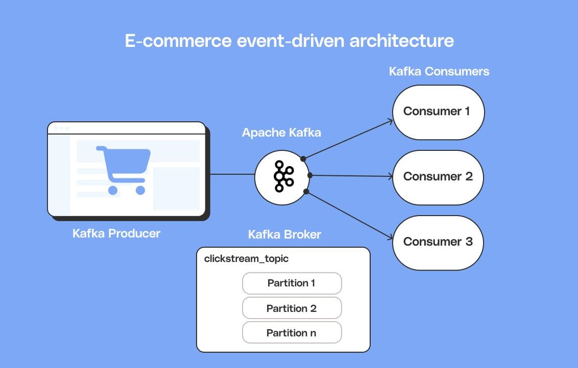 - When a user interacts with the e-commerce platform, each action, such as browsing products, adding items to their cart, or making a purchase, generates a click event. These click events are captured and sent to Kafka producers.