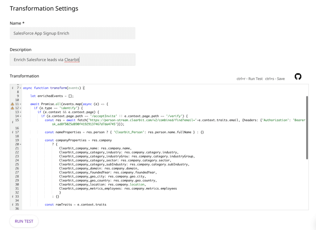 Transformations (JavaScript and DBT) — RudderStack Cloud introduces support of in-transit transformations written in JavaScript, configured per-destination in our platform. We also support at-rest transformations using DBT. Powerful and configurable RudderStack models built on DBT can be deployed on your data warehouse to perform tasks like identity stitching and sessionization, turning your warehouse into a featured customer data platform.