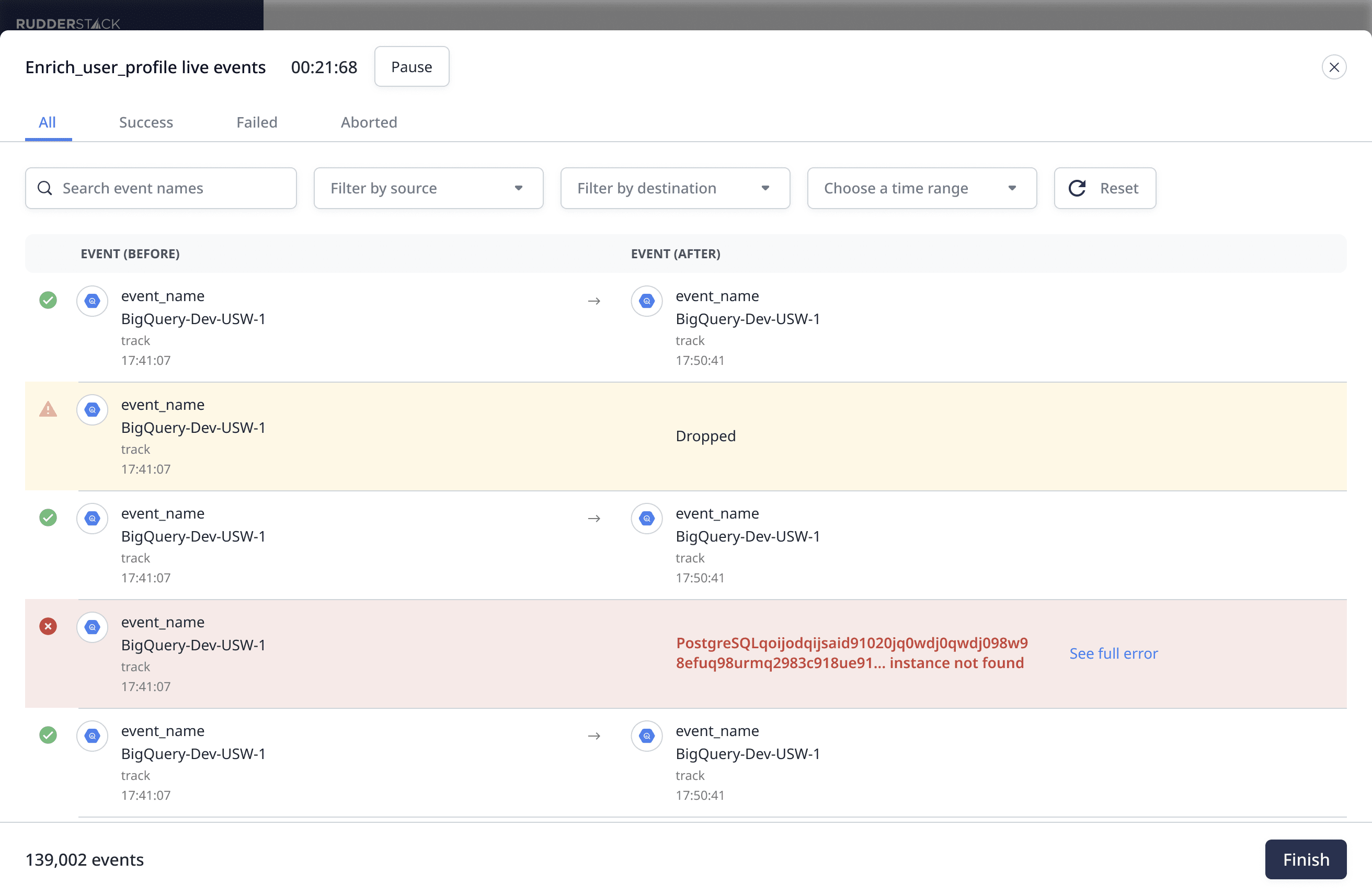 If a destination has a Transformation applied, you can use the Transformations Live Debugger to get detailed information about the incoming and outgoing payloads, including any errors.