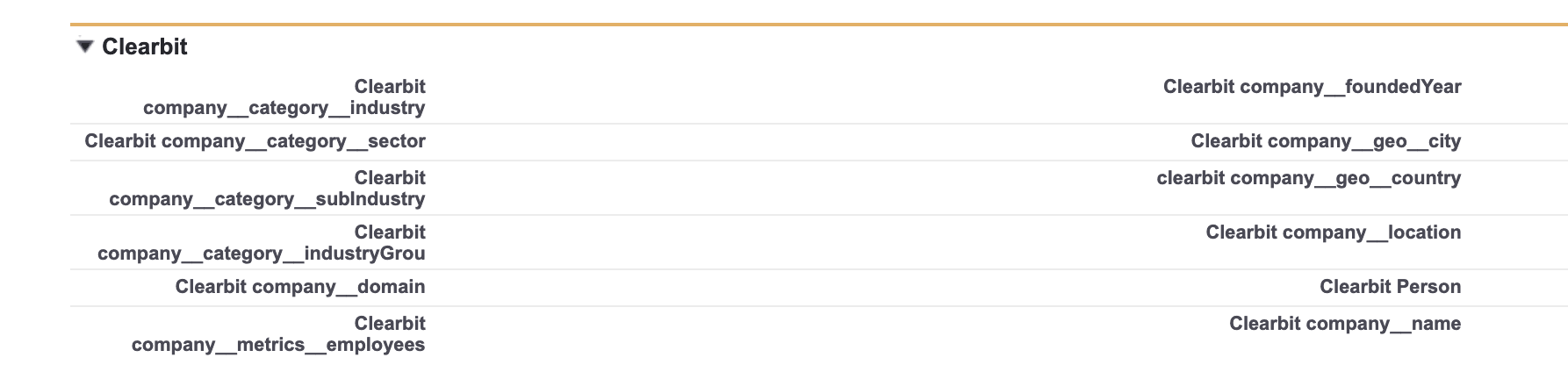 export async function transformEvent(event) {event.traits = {email:event.properties['Email'],lead_id:event.properties['Lead_ID'],company:event.properties['Company'],firstName:event.properties['FirstName'],lastName:event.properties['LastName']}event.context = {externalId : [{id:event.properties['Lead_ID'],type:'Salesforce-Lead'}]}// Only send identify() calls and leads with email addressesif (event.traits.email) {const res = await fetch('https://person-stream.clearbit.com/v2/combined/find?email='+event.traits.email, {headers: {'Authorization': 'Bearer sk_your_token_id'}});const nameProperties = res.person ? { 'Clearbit_Person': res.person.name.fullName } : {}const companyProperties = res.company? {Clearbit_company_name: res.company.name,Clearbit_company_category_industry: res.company.category.industry,Clearbit_company_category_industryGrou: res.company.category.industryGroup,Clearbit_company_category_sector: res.company.category.sector,Clearbit_company_category_subIndustry: res.company.category.subIndustry,Clearbit_company_domain: res.company.domain,Clearbit_company_foundedYear: res.company.foundedYear,Clearbit_company_geo_city: res.company.geo.city,Clearbit_company_geo_country: res.company.geo.country,Clearbit_company_location: res.company.location,Clearbit_company_metrics_employees: res.company.metrics.employees}: {}const rawTraits = event.traits;const whiteListTraits = ['utm_campaign','utm_content','utm_content','utm_medium','utm_source','utm_term','raid','email','company','conversion_page','title','conversion_page','multiple_form_fills','number_form_fills','createddate'];const filteredTraits = whiteListTraits.reduce((obj, field) => ({...obj, [field]: rawTraits[field]}), {})const newTraits = Object.assign(filteredTraits, nameProperties, companyProperties)event.traits = newTraitsevent.integrations = {Salesforce: true };event.type = 'identify';delete event.properties;delete event.event;}return event;}
