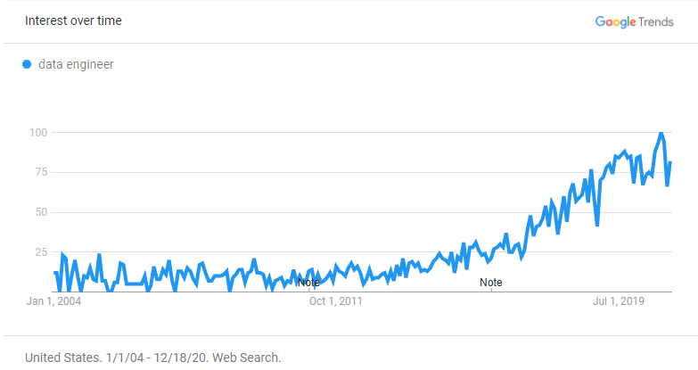 But how did we get here? The actual work of dealing with data has been around for a long time (think DBAs). Though as a unique discipline, data engineering is relatively new. Google Trends shows the term starting to pick up steam in 2016, and recently it has hit near peak popularity.