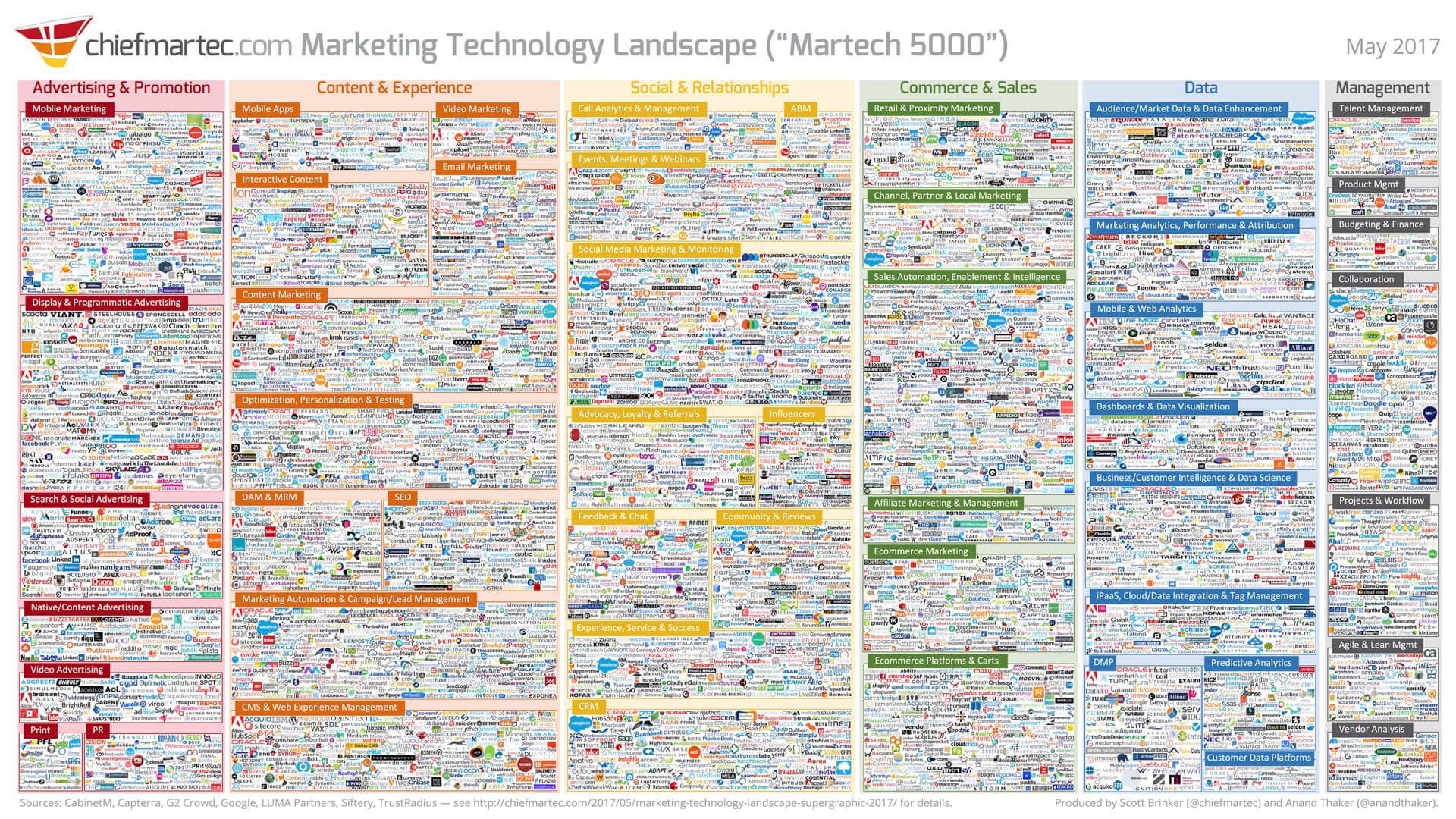 This boom in the software industry created the now-famous explosion of the "mar-tech" landscape, which grew from 150 tools to 5,000 by 2017 (and even more exponential growth in recent years). Software companies built both as comprehensive suites and best-of-breed point solutions, which we'll come back to later in the post.