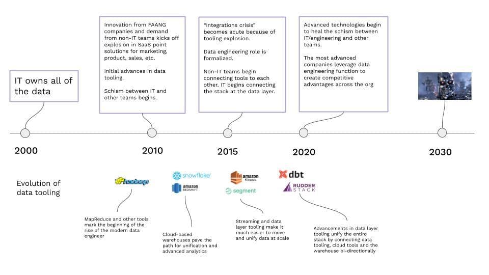 This period saw the birth and rise of significant data-focused technologies. Building on the foundations laid by technologies like Google's Map Reduce and Hadoop, we saw the beginnings of RedShift and Snowflake, advanced data workflow tooling, and wider adoption of "the cloud". (Remember when that was the new hot term?). Now commonplace, these tools were significant advances for IT/engineering as far as data flows and unification.