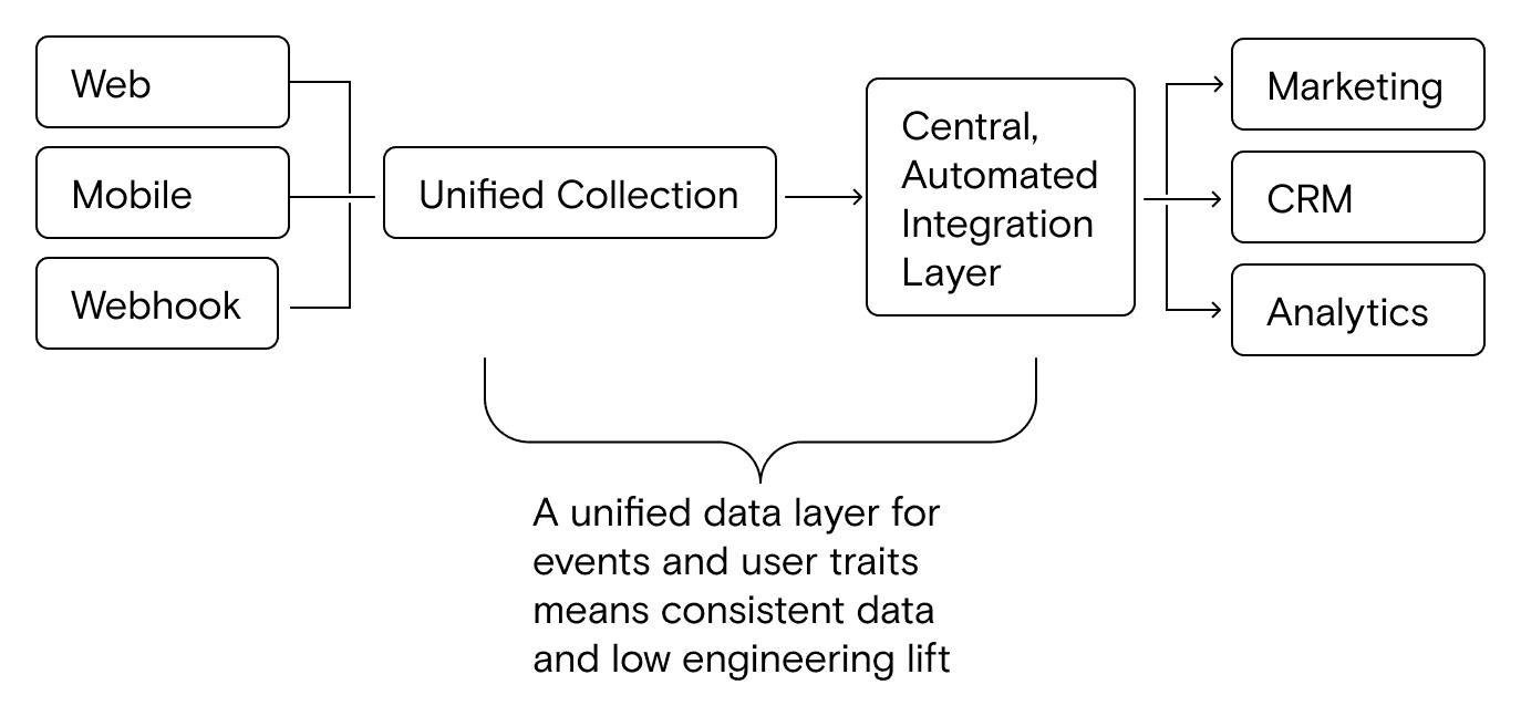 That’s where the integration layer comes in. Instead of running multiple SDKs and sending events in various formats, you translate the standardized payloads for each destination, meaning each different API is getting the same set of data.