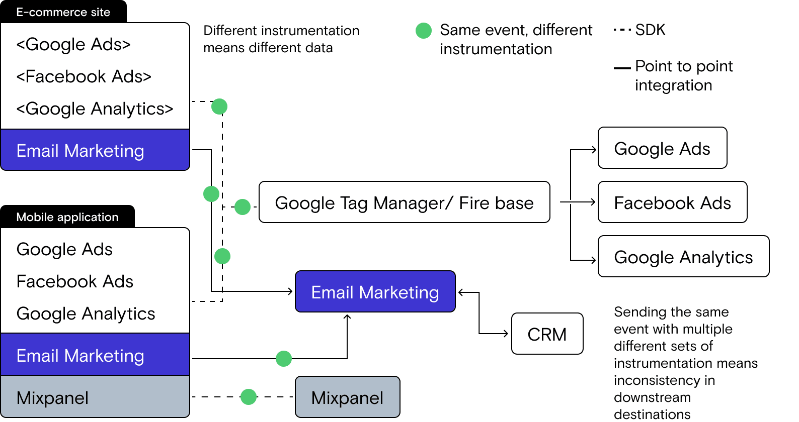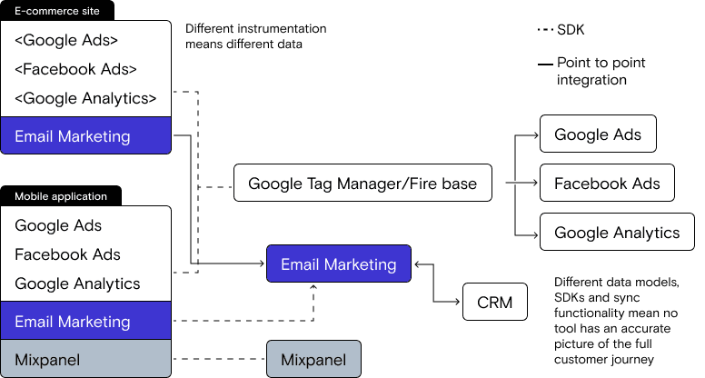 Your website runs on a 3rd-party platform (like Shopify or BigCommerce). On the website, your marketing team runs scripts for Google Ads, Facebook Ads, and Google Analytics, all via Google tag Manager. Their email marketing tool is connected to the eCommerce platform with a point-to-point integration.