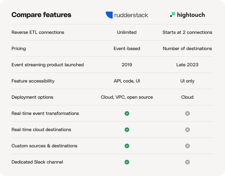 Unlike Hightouch, RudderStack supports over 200 destinations, while Hightouch has 150.