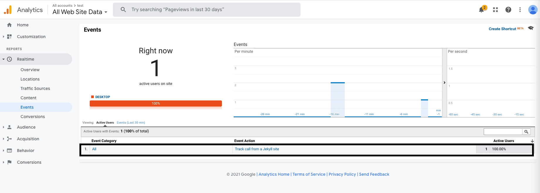 As you can see, we have one active user on our Jekyll site, and the track event is visible too. This shows that the event has been tracked and delivered successfully. Similarly, you should also receive the event in your Google BigQuery warehouse.