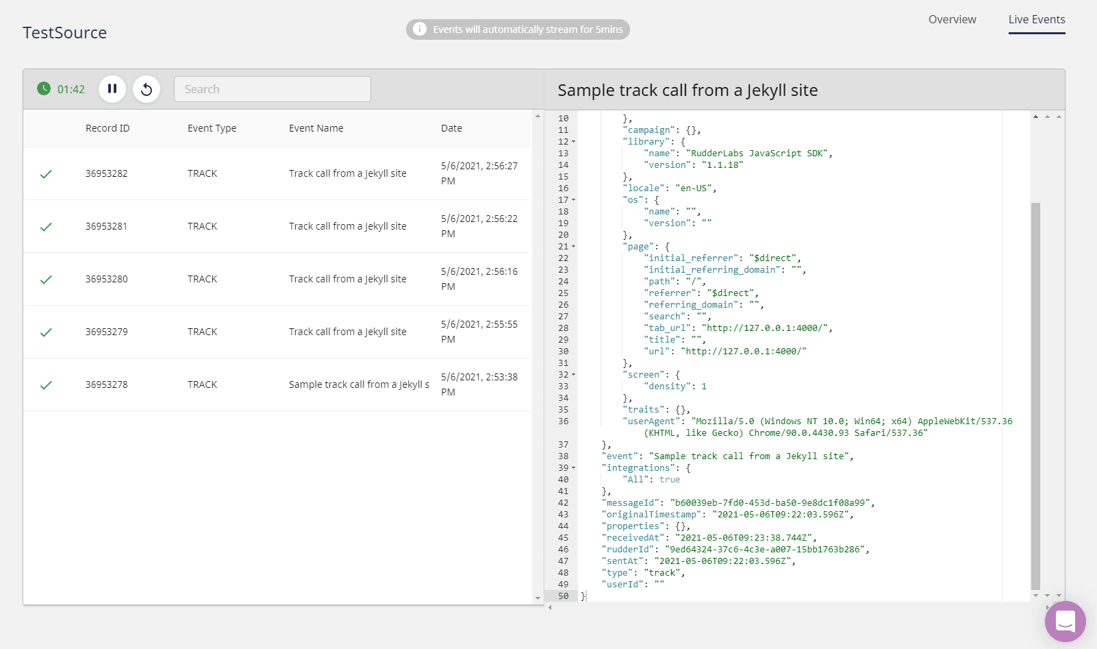 5. Check if RudderStack can track the different pageviews and clicks by clicking on the Live Events tab of your JavaScript source on the RudderStack dashboard page: