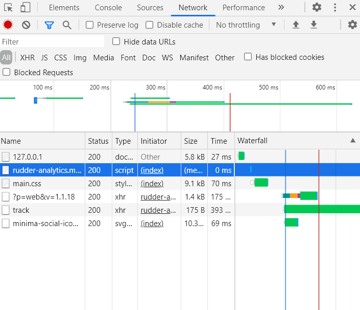 4. Next, verify if rudder-analytics.js (RudderStack’s JavaScript SDK) has loaded correctly. To do this, go to your browser’s Developer tools and navigate to the Network tab. The following screenshot highlights this option for Google Chrome: