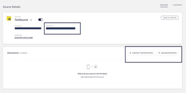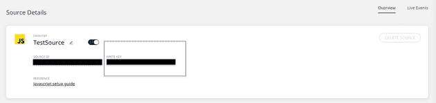 6. Your JavaScript source is now configured and ready to track events. Note the Write Key associated with this source. You will need it to set up the RudderStack integration with your Nuxt.js app.