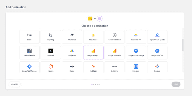 RudderStack supports over 80 third-party tools and platforms to which you can securely send your tracked events. In this tutorial, we will route the Nuxt.js app events to Google Analytics. To add Google Analytics as a destination in RudderStack, follow the steps given below: