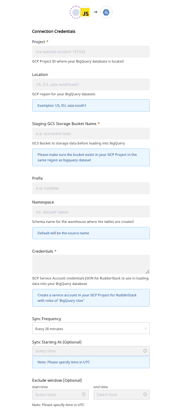 We will set up a Google BigQuery warehouse destination for this tutorial to route all the events from our Nuxt.js app. You can set up a BigQuery project with the required permissions for the service account by following our documentation.