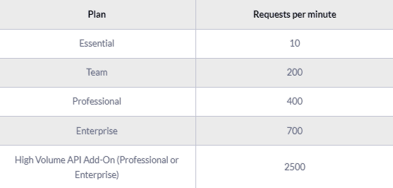 The API is rate-limited. It only allows a certain number of requests per minute, depending on your plan and the endpoint. Zendesk reserves the right to adjust the rate limit for given endpoints to provide a high quality of service for all clients. The current limits are the following: