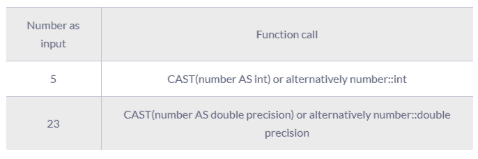 The cast function takes as input an expression that evaluates to one or more values, such as a column name or a literal and returns the data types specified by the type argument.