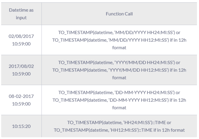 This can be overcome by using explicit casting with the :: annotation but in this case, this won’t work with a wide range of date formats as TO_DATE() .