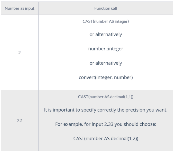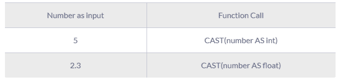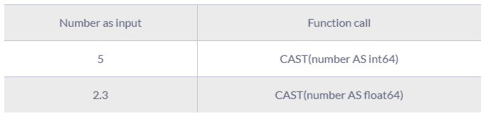 Cast function performs as in every other database mentioned in this post using the following syntax: CAST(expr AS typename).