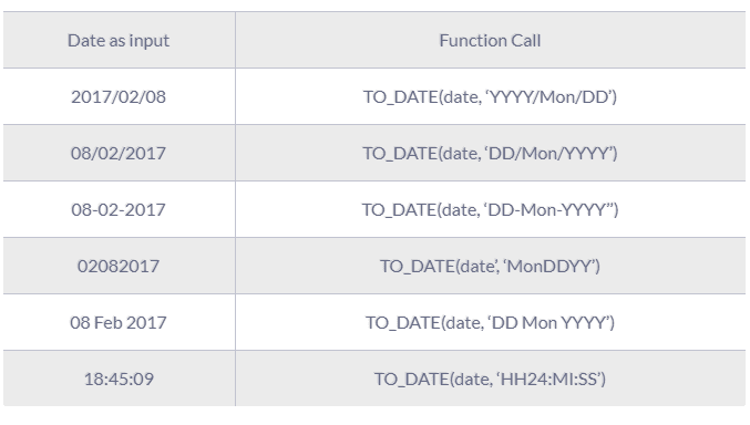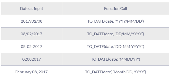 When in comes to date conversions, the most suitable one is the TO_DATE(). This function takes two arguments: the first is a string that represents some date and the second one the format in which we want to represent this specific date.