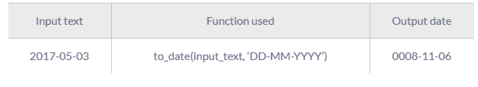 Below we have intentionally declared the wrong date format and nevertheless, PostgreSQL returns a valid, yet meaningless, date.
