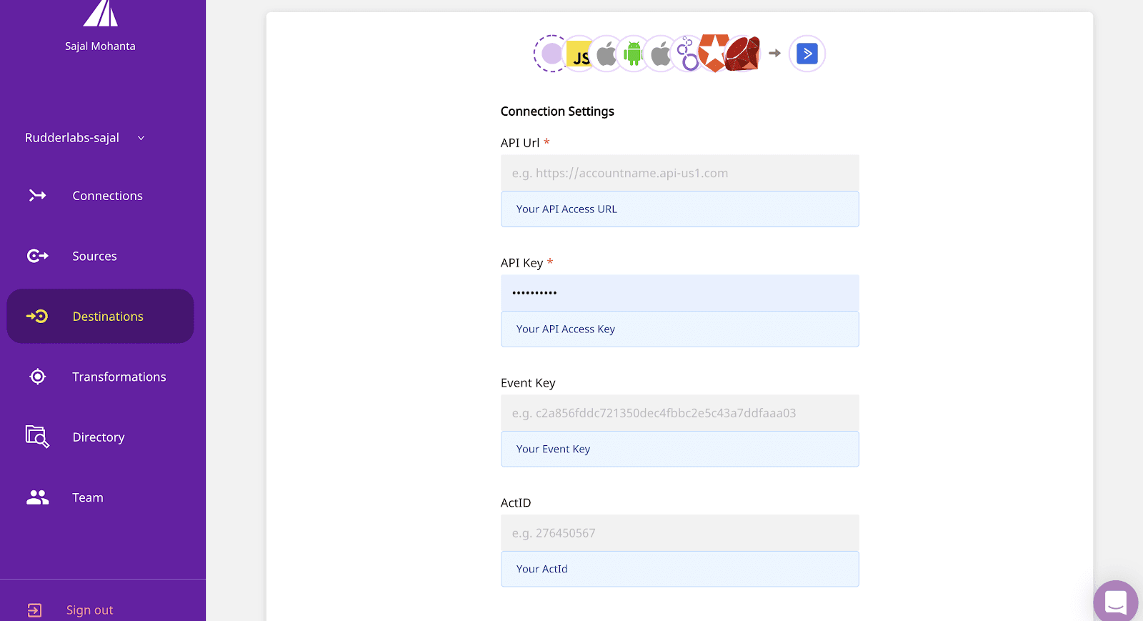 Adding a destination and connecting it to a source from the RudderStack dashboard is effortless. You’ll need a token or API key for the destination or some way to confirm your account in the tool.