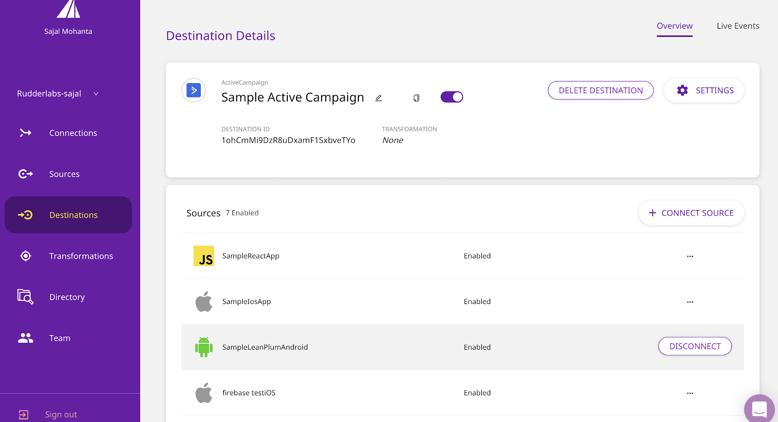 You can also connect the previously added destination(s) to your other Source (s) using CONNECT DESTINATIONS by visiting your Source in the Sources catalog.