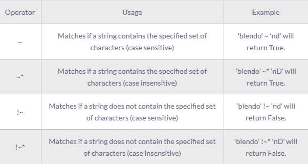 The simplest case is when you want to check if a string contains or does not contains a specified set of characters. In PostgreSQL and Redshift, the operator widely used is the tilde (~). The tilde can be combined with other operators such as (*) and (!) to form different matching conditions.