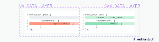 There are not many changes to the structure of the data sent in the data layer, but one of the main differences is that parameters that used to be more specific, such as impressions or products, have now been generalized to items, which works better with GA4’s event-based model. For example, while UA’s eCommerce tracking generally relied on passing an eCommerce object with a specified structure to trigger specific behavior in UA, GA4’s event-based model changes this approach slightly. You still need an eCommerce object, however the object is a lot more standardized and you need to pass a specific event to tell GA4 what eCommerce activity this data relates to (such as view_item, purchase, etc.)