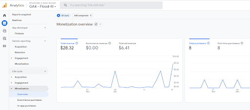 To access eCommerce reports in GA4, you can view the “Monetization overview” section within the “Life cycle” section of Reports, which provides time-series graphs with information such as revenue, number of customers, and revenue per customer.