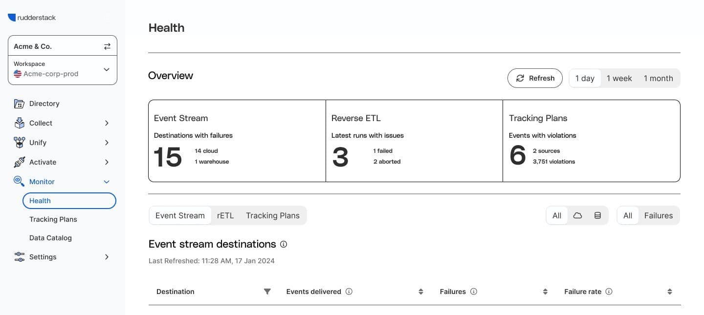 To empower your team to focus on their most important work, you have to trust the data quality measures you have in place and establish processes to trigger efficient troubleshooting when required. That’s where our health dashboard comes in. It gives you a global view of your entire customer data stack, providing a central place to monitor the health of your data sources and destinations. It also gives you visibility into any tracking plan violations. You can use it to apply custom rules for alerting to any source or destination and route alerts to your tool of choice, whether that’s Slack, PagerDuty, or another tool.