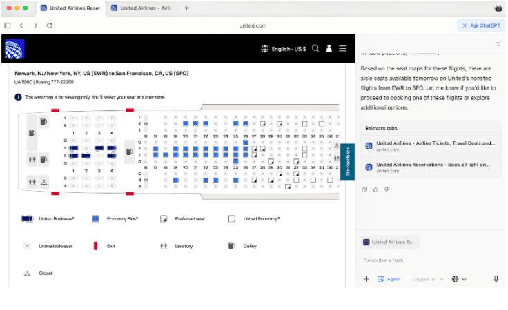 United Airlines seat picker shown by Atlas browserFor tasks like this—nuanced, multi-constraint decisions—I can already see Atlas becoming a regular part of my workflow. And I suspect many others will feel the same once they try it.