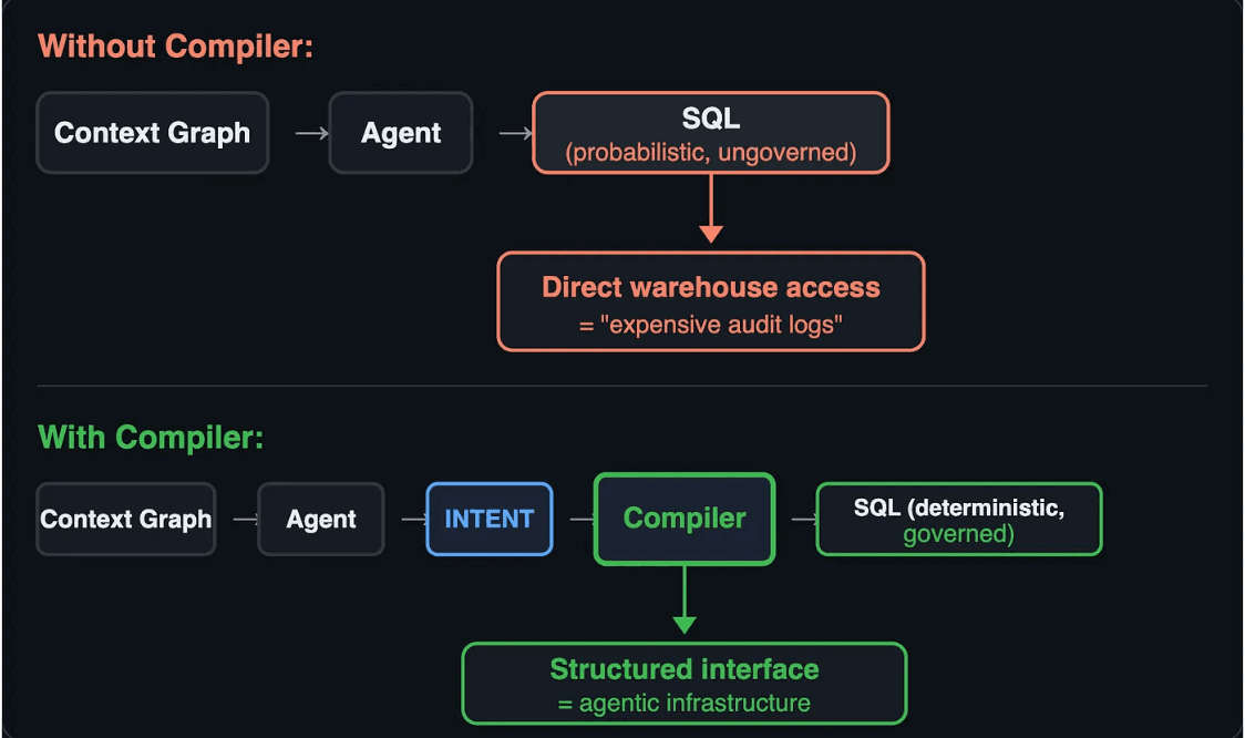 Without the compiler, the flow is: context graph feeds the agent, agent outputs SQL, SQL hits the warehouse directly. The context makes the agent better informed. It does not make the output governed or deterministic.