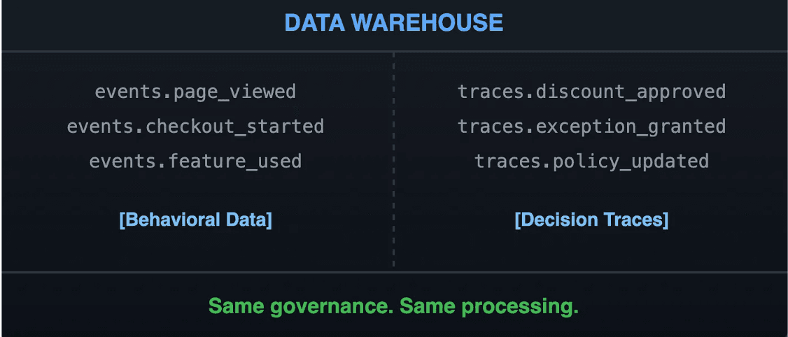 Behavioral events land in the warehouse: same governance, same compliance, same processing infrastructure. Decision traces should land there, too, not only in a separate specialized store.