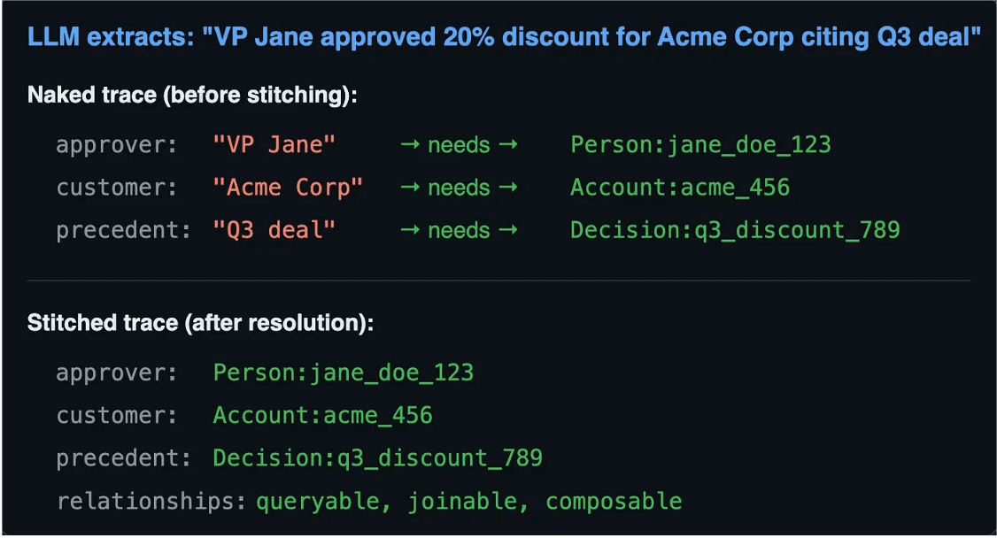 When an LLM extracts a trace from a Slack message, the raw output might read: Approver is "VP Jane," customer is "Acme Corp," precedent is "Q3 deal." Before that trace is useful, those references need resolution: "VP Jane" becomes Person:jane_doe_123, "Acme Corp" becomes Account:acme_456, "Q3 deal" becomes Decision:q3_discount_789. Only then is the trace queryable, joinable, and composable with the rest of the graph.