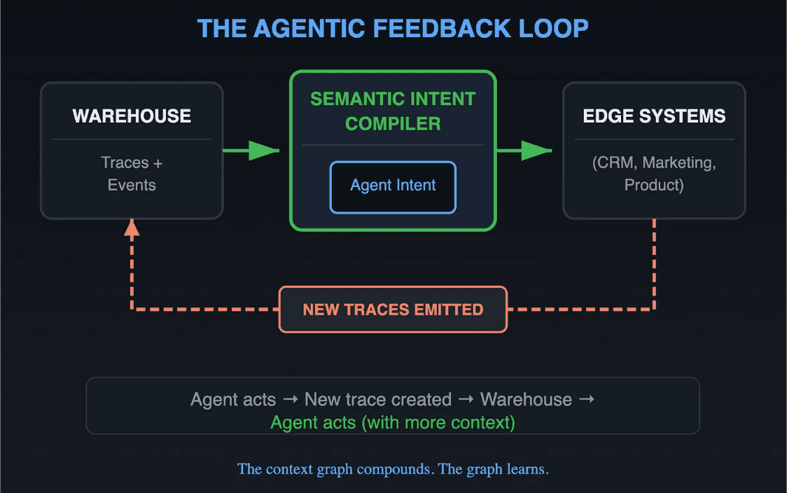Every agent action creates new decision traces. An agent approves a discount and a trace.discount_approved event is emitted. An agent routes an exception and a trace.exception_routed event is written. Those traces flow back into the warehouse. They get ID-stitched to existing entities. They become available for future queries.
