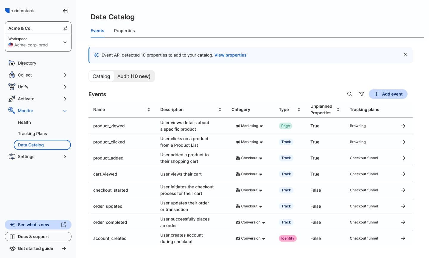 - Event Audit API – We build everything with the data practitioner in mind. RudderStack doesn’t confine your data catalog to a rigid UI. You can access the entire thing via our Event Audit API. Using the API, you can programmatically audit your catalog, streamline troubleshooting, and report on the catalog as a whole while maintaining an efficient workflow. The API gives you access to useful information such as lists of events from the catalog, individual event versions, schema detail, and property counts.