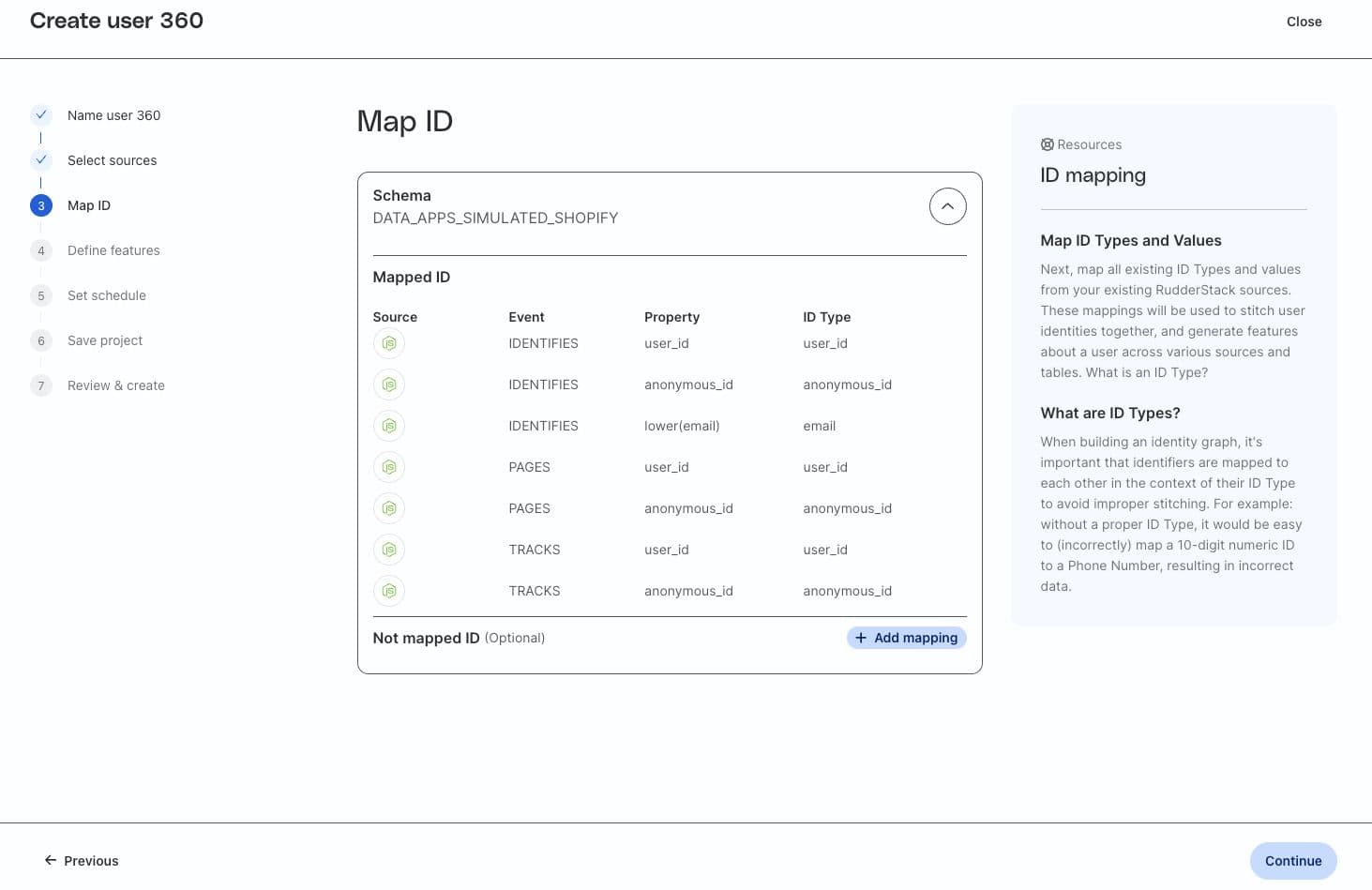 Practically, this means that data engineers, analysts, and even technical ops or marketers, can use the RudderStack UI to select RudderStack sources, map identifiers, and run a job that produces an identity graph in their warehouse. In fact, Profiles automatically maps standard identifiers (anonymousId, userId, and email).
