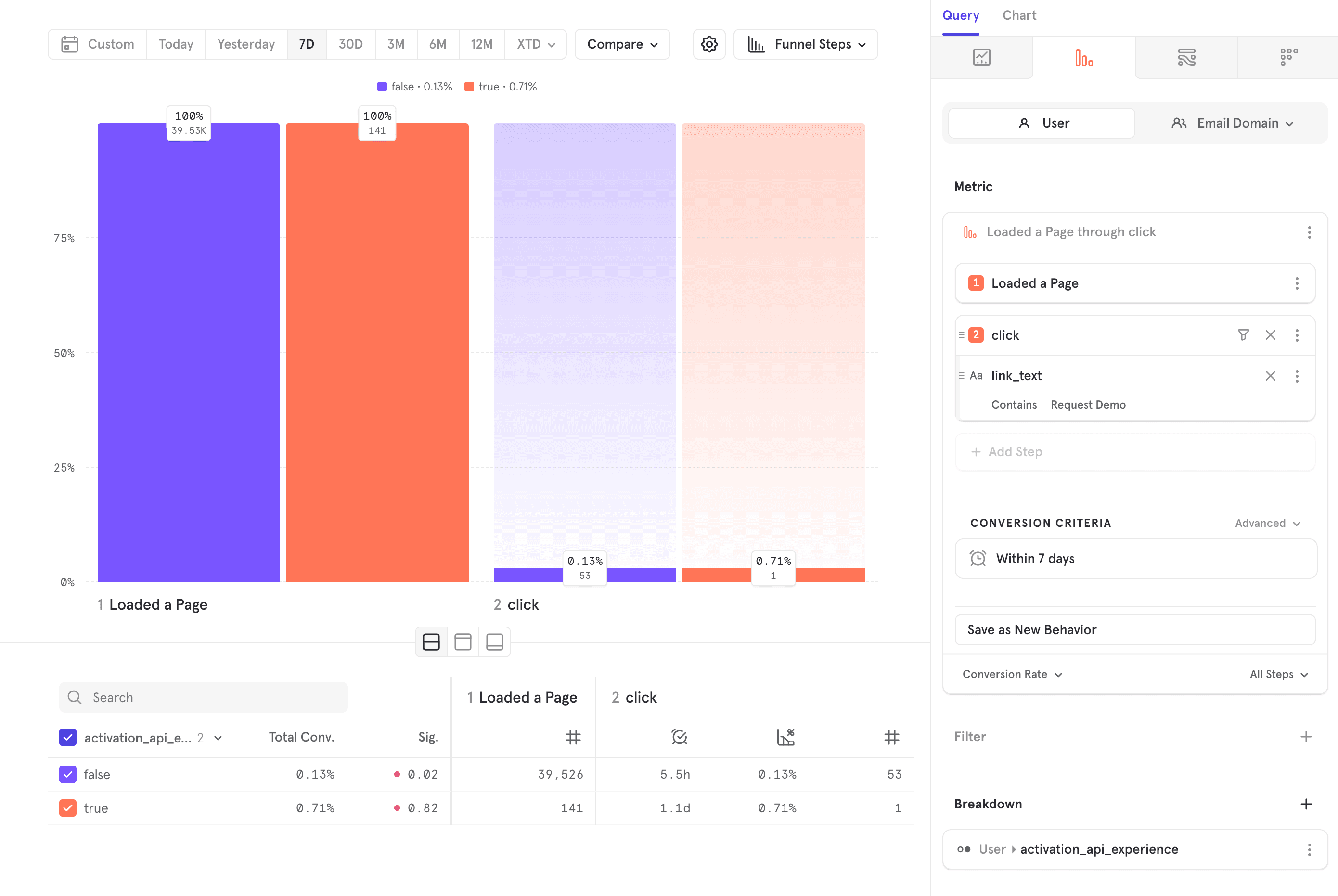 The nice thing for our marketing team is that they can use their existing reporting tool and simply segment reports using the activation_api_experience trait. Here’s a screenshot of what this looks like in Mixpanel (pardon the inconclusive data...this was taken right after the experiment launched):