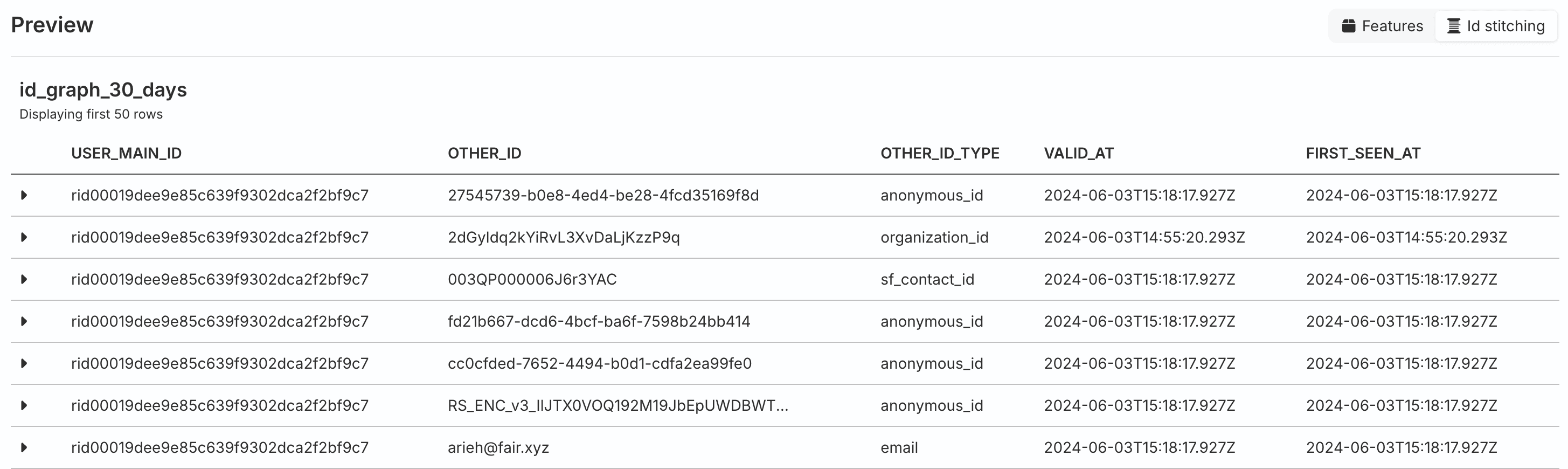 Here’s what the final ID graph looks like when previewed in the RudderStack UI (which is reading directly from the Snowflake table):