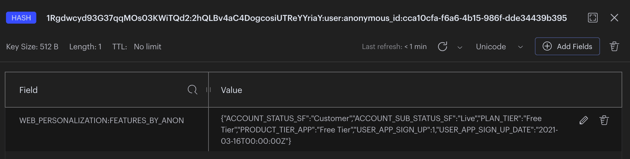 Once the initial sync ran, our feature view was loaded to Redis and accessible via the Activation API endpoint. Notice the anonymous_id value in the hash.