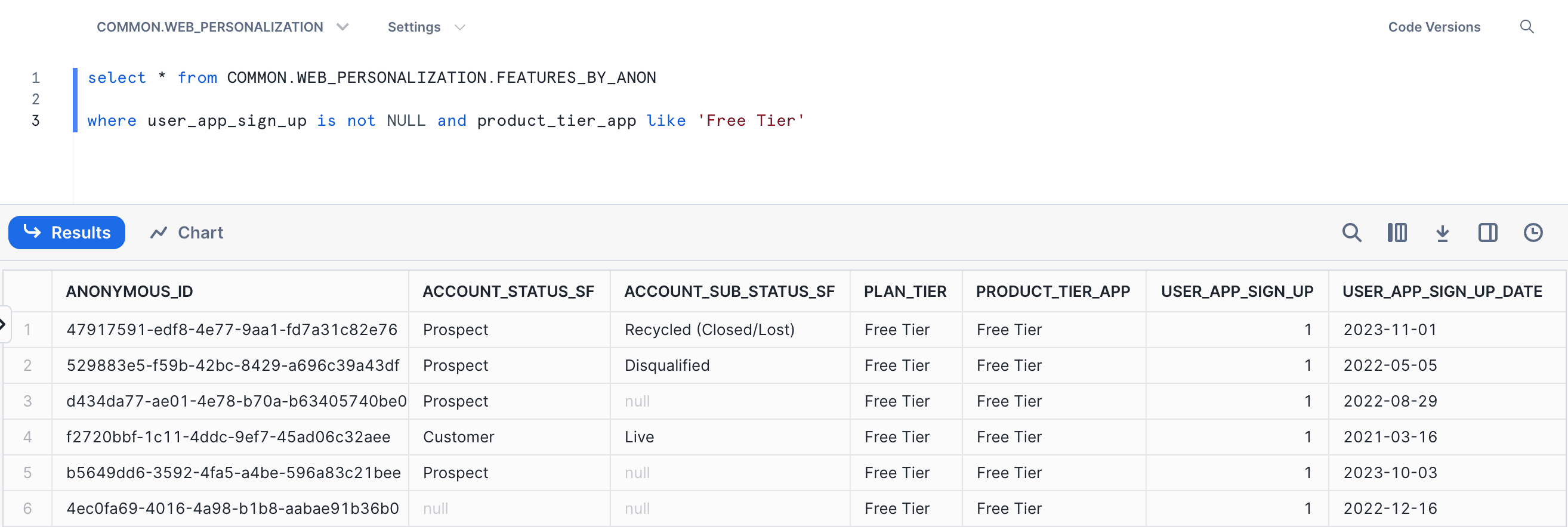 Here’s what the FEATURES_BY_ANON view looks like in Snowflake: