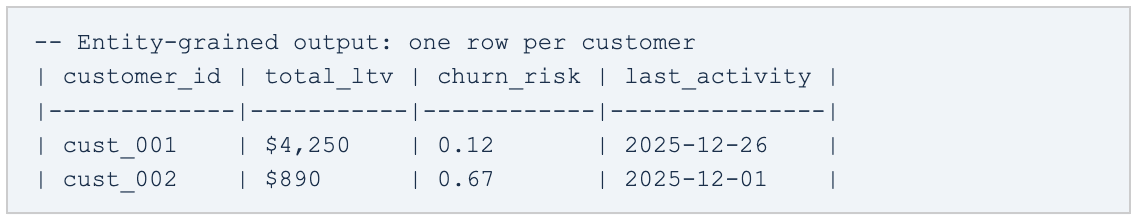 The output is one row per customer, not one row per day. You’re not asking “What was the total revenue yesterday?” You’re asking: “What is this customer’s lifetime value?” “Which users are at churn risk?” “What cohort does this account belong to?”