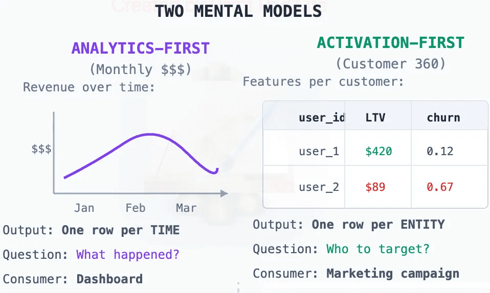 The diagram below shows the distinction clearly. Analytics-First pipelines operate on time grain, outputting one row per time window. The consumer is a dashboard asking "What happened?" Activation-First pipelines operate on entity grain, outputting one row per entity. The consumer is a campaign, a model, or an AI agent asking "Who to target?"