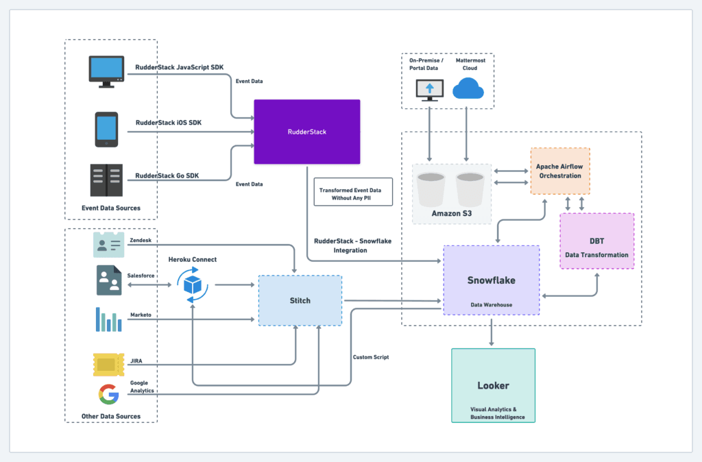 Mattermost is an open-source messaging and collaboration platform built for high-trust environments. They handle massive volumes of data generated by their enterprise customers and have built their infrastructure on modern tooling, including Snowflake, DBT and RudderStack Cloud.