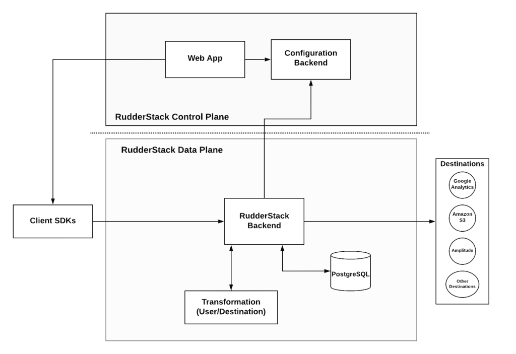 The above diagram shows a high-level architecture of RudderStack. The underlying mechanism on the backend or Data Plane is responsible for implementing the integrations with the destinations. This same mechanism is responsible for user transformations.